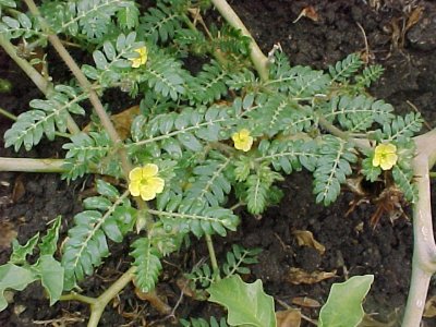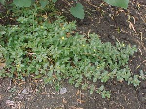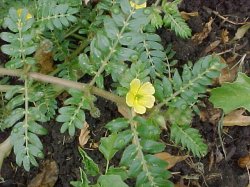 BOTANICAL DESCRIPTION: General: A perennial, flat-growing, creeper with an underground root system from which a number of branches develop annually, spreading around to cover the soil. Leaves: The leaves are compound with 5 - 8 pairs of leaflets. These are even woolly when young. Flowers: The small yellow flowers are borne in the axils of the leaves. Fruit: Woody fruit with strong, sharp, conical, spiny growths.