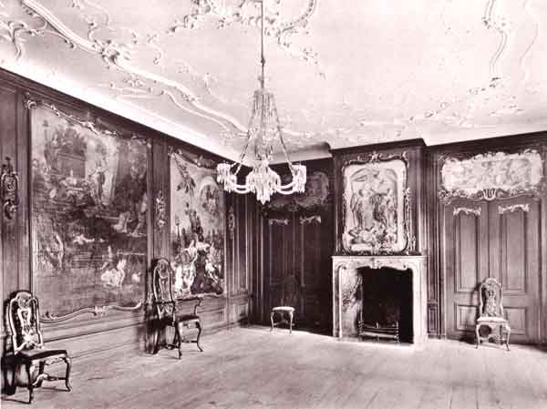 From the Pearse Collection: photograph depicting the Rococo interior of the Town Hall in Dokkum, with plastered ceiling and wood-panelled walls framing painted insets. The chairs depicted display influences of the Queen Anne style. Photograph probably considered for prof. Geoffrey Pearse's book "Eighteenth Century Furniture in South Africa", but never included.