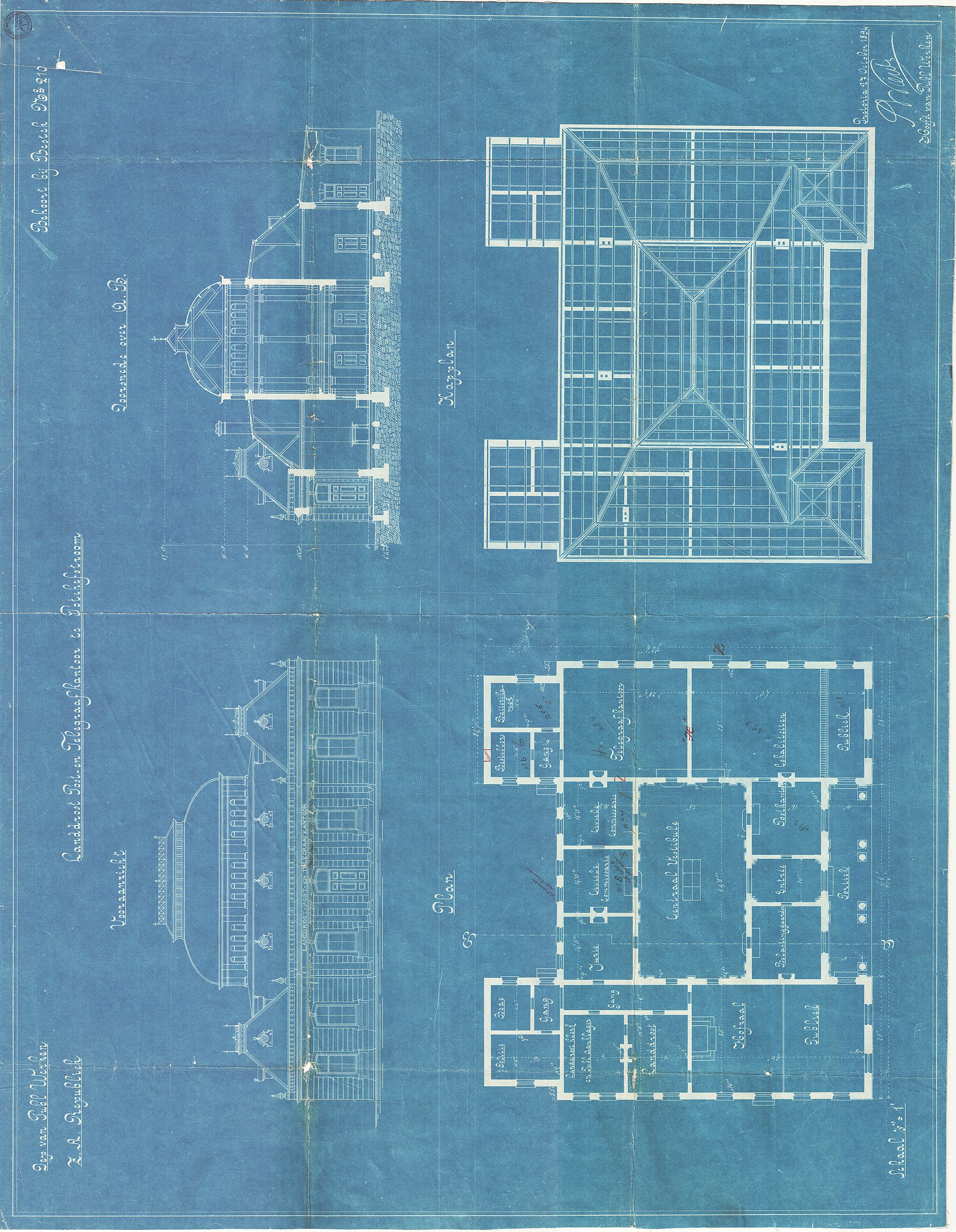 Digitised version of National Archive file S.2/123.Drawings of the Magistrate's and Post and Telegraph Office, Potchefstroom, depicting the "Vooraanzicht, Doorsnede, Plan, Kapplan" (Front Elevation, Section, Plan, Truss Plan). Signed by "S.W. Wierda, Hoofd, Publieke Werken"