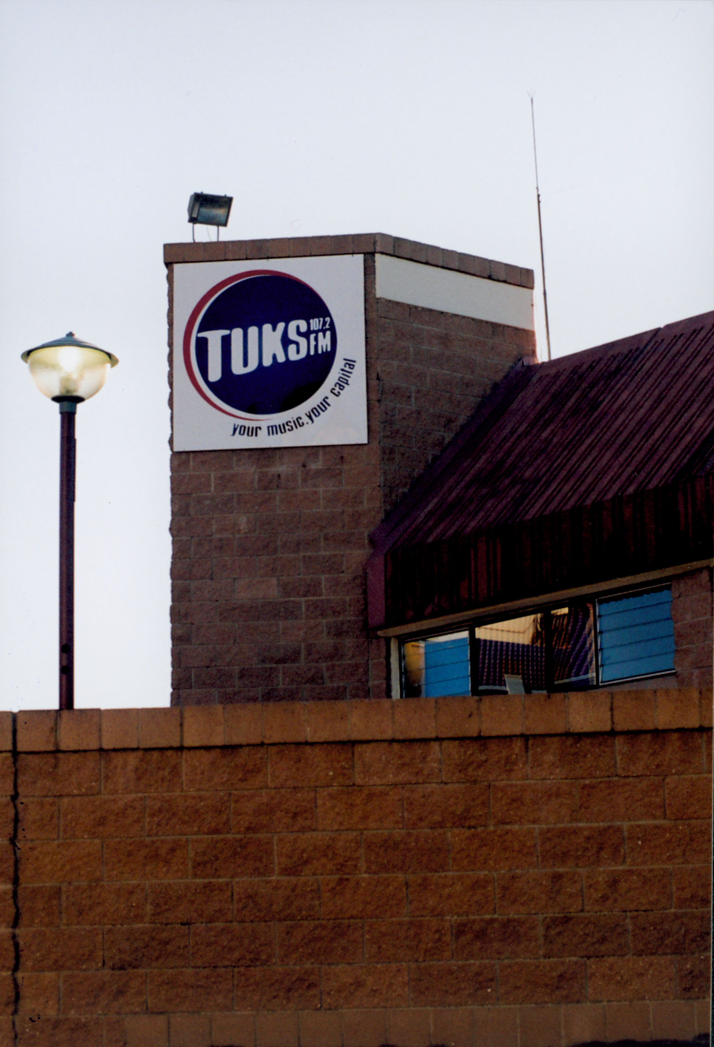 Side view of the Student Centre displaying TuksFM poster, Hatfield Campus, University of Pretoria.