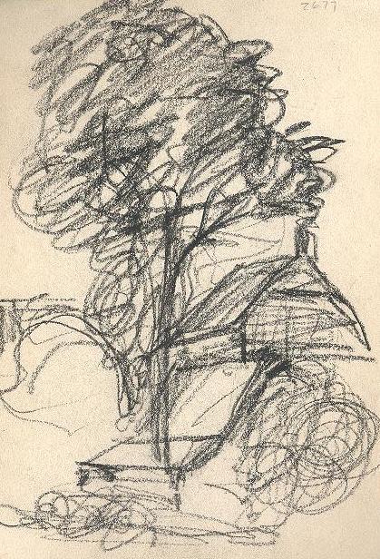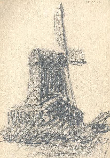 Charcoal sketches by Reus portraying two farm buildings with a large tree on the left. A windmill on a river bank is drawn on the back.