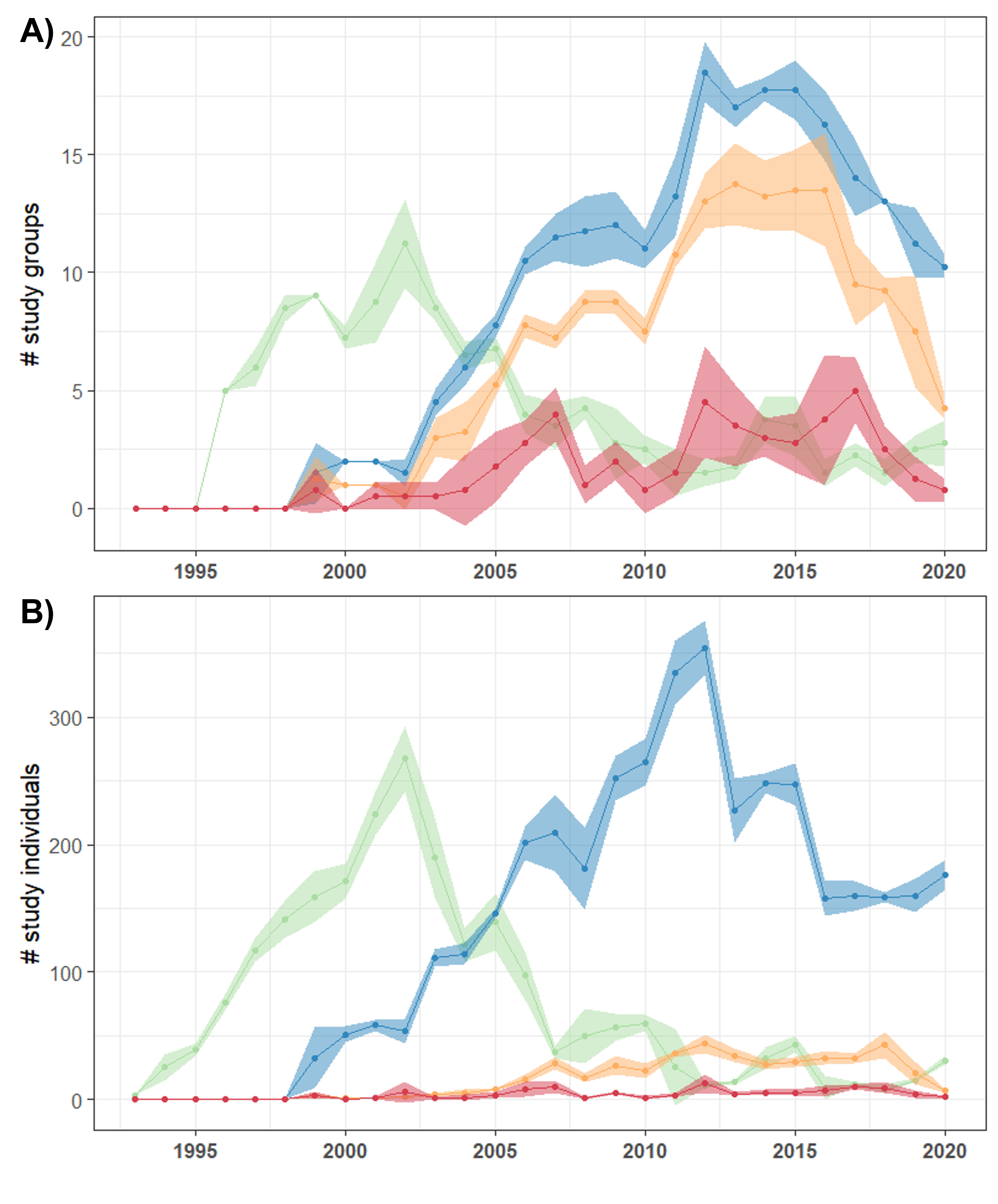 FIGURE S1. Patterns of TB exposure, prevalence of clinical signs and TB-related death over 27 years of research at the Kalahari Meerkat Project (South Africa) illustrating the inter-annual variation and development of TB prevalence within the study population. The numbers of A) study groups and B) study individuals of the study population being not exposed yet (green), exposed (blue), displaying clinical signs of TB (orange) or dying with confirmed TB (red). Means ± SD of each measure were calculated in 3-month increments.