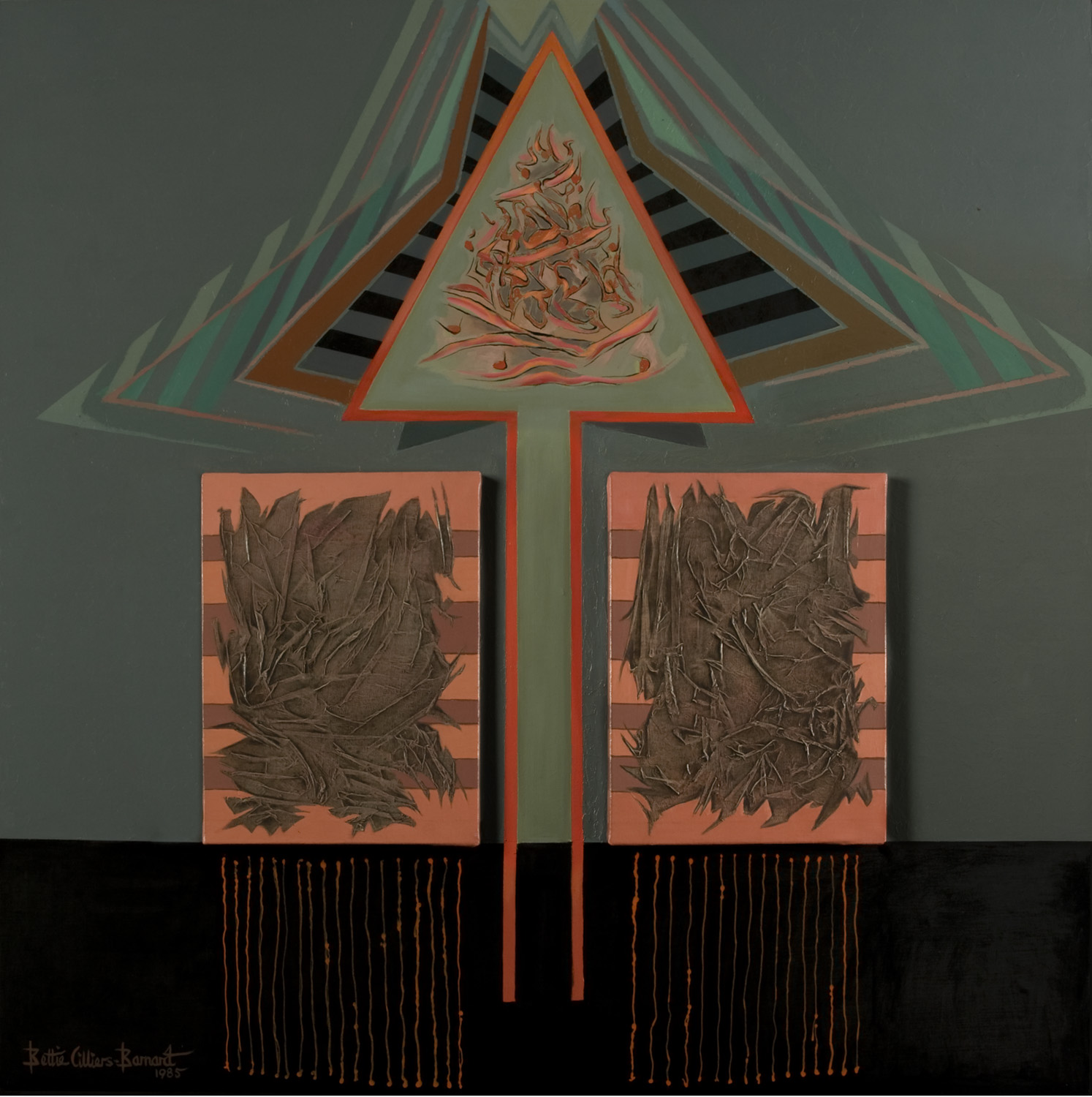| dc.description | In this work the sublime qualities of space, time and movement are investigated. An upwards directed arrow is placed between two rectangular blocks filled with forms. In a way it becomes a sort of “predikant” or pointer wanting to show us the way. | en_ZA |