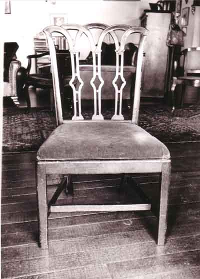 Photograph depicting a late 18th century chair in the Sheraton taste. It has plain square tapered legs braced by stretchers. The seat is upholstered and the back has three decorative slats forming arches at the top rail. Photograph probably considered for prof. Geoffrey Pearse's book "Eighteenth Century Furniture in South Africa", but never included.