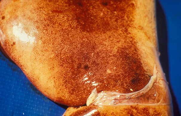Rift Valley fever (RVF) in a new-born lamb : liver showing severe enlargement, orange-brown discolouration of the organ and scattered congested patches