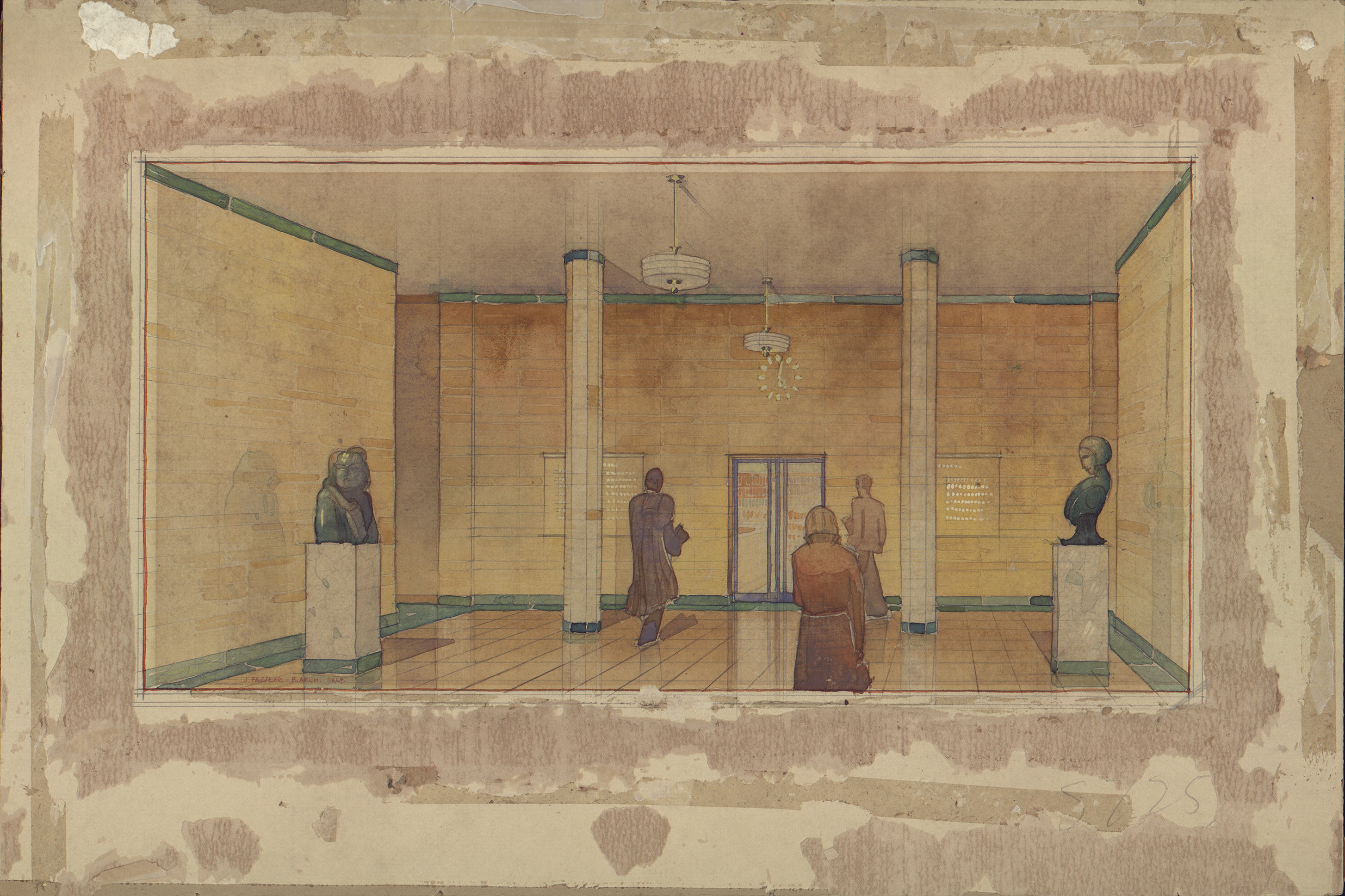 | dc.description | A perspective of the proposed foyer to the Cullen Library. John Fassler worked as project architect for GE Pearse. The building is particularly interesting as a transitional one with its Ionic columned portico, its Neo Classical exterior and Modernist interior . Condition: mount board damaged lower LHS. | en_ZA |