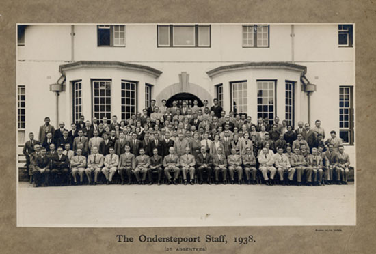Group photo of the 1938 staff members at Onderstepoort Veterinary Institute. 25 absentees. The photo was taken by Alan Yates Studio in front of the main building at Onderstepoort.